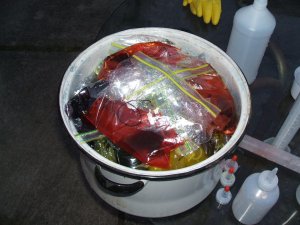 I worked out a set of samples to try, with different levels of single dyes, pairs, and trios in different ratios. The first batch was 28 samples. Because I was working with such small quantities of fiber (1 g), I diluted my stock solutions down again (10 mL of 1% stock to 90 mL of water) so that I could measure more easily. The samples were 2, 4 or 6% dye baths, with a squirt of citric acid solution (about a mL of 0.1% solution because it was a convenient amount), and enough water so that the fiber would move freely in the ziploc. Got lots of tiny, tiny samples? Ziplocs, of course!